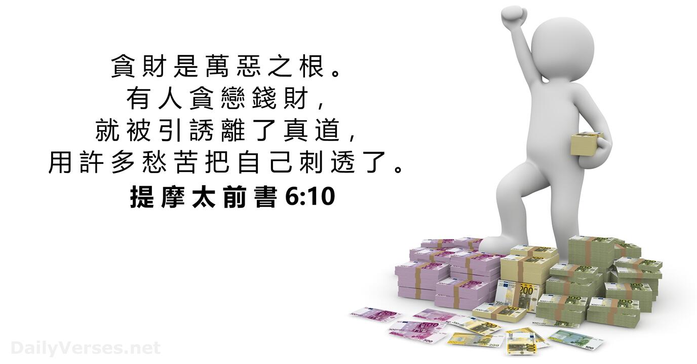 “但那些想要发财的人,就陷在迷惑,落在网罗,和许多无知有害的私欲里,叫人沉在败坏和灭亡中。贪财是万恶之根。有人贪恋钱财,就被引诱离了真道,用许多愁苦把自己刺透了。” (提摩太前书6:9–10)