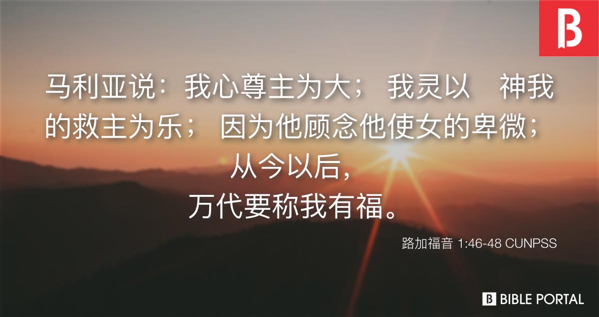 “马利亚说,我心尊主为大,我灵以神我的救主为乐。因为祂顾念祂使女的卑微。从今以后,万代要称我有福。那有权能的为我成就了大事。祂的名为圣。祂怜悯敬畏祂的人,直到世世代代。祂用膀臂施展大能。那狂傲的人,正心里妄想,就被祂赶散了。祂叫有权柄的失位,叫卑贱的升高。叫饥饿的得饱美食,叫富足的空手回去。祂扶助了祂的仆人以色列,为要记念亚伯拉罕和他的后裔,施怜悯,直到永远,正如从前对我们列祖所说的话。”(路1:46–55)