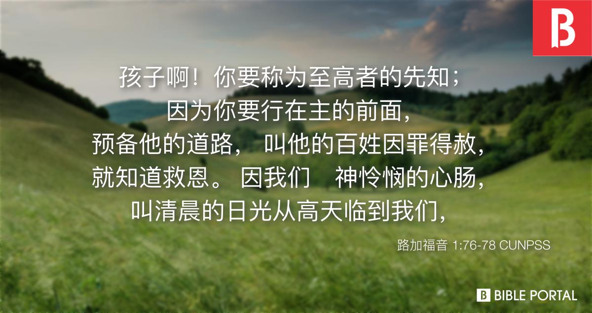 撒迦利亚预言他儿子约翰的使命:“孩子啊,你要称为至高者的先知。因为你要行在主的前面,预备祂的道路。叫祂的百姓因罪得赦,就知道救恩。因我们神怜悯的心肠,叫清晨的日光从高天临到我们,要照亮坐在黑暗中死荫里的人。把我们的脚引到平安的路上。” (路1:76–79)