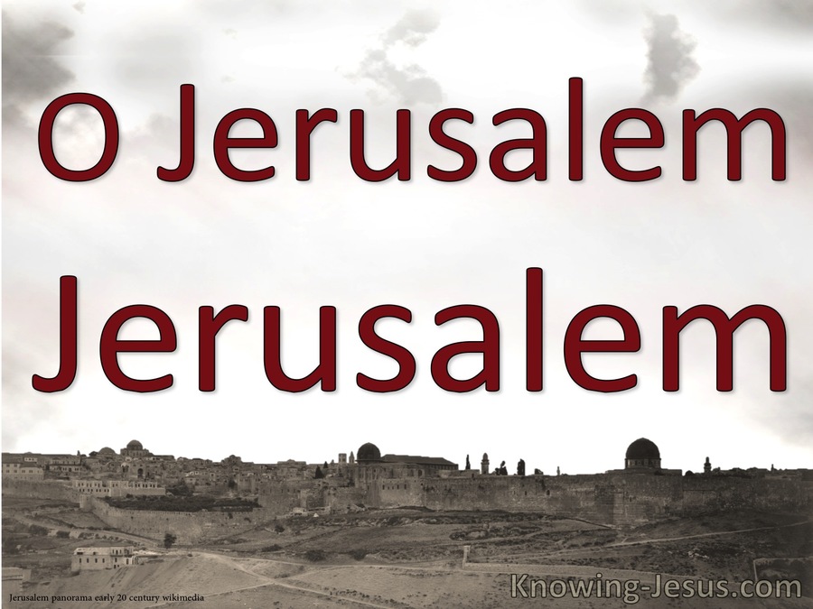 面对祂要在此舍命,并且是为此舍命的耶路撒冷,耶稣曾叹息说,“耶路撒冷啊,耶路撒冷啊,你常杀害先知,又用石头打死那奉差遣到你这里来的人。我多次愿意聚集你的儿女,好像母鸡把小鸡聚集在翅膀底下,只是你们不愿意。看哪,你们的家成为荒场留给你们。我告诉你们,从今以后你们不得再见我,直等到你们说,奉主名来的是应当称颂的。”(路13:34–35)