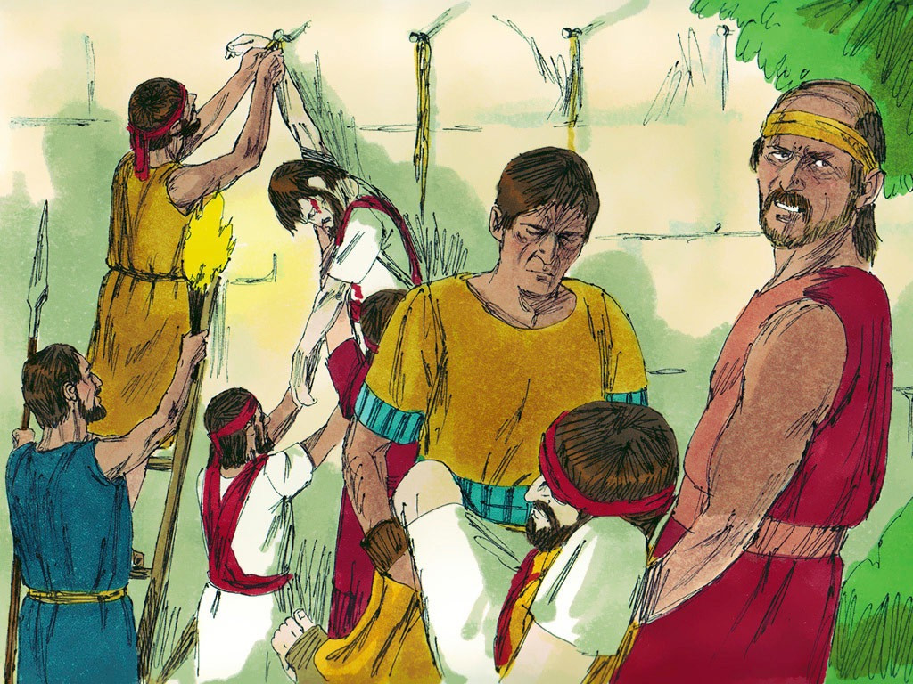 非利士人与以色列人争战;以色列人在非利士人面前逃跑,在基利波有被杀仆倒的。非利士人紧迫扫罗和他儿子们,就杀了扫罗的儿子约拿单、亚比拿达、麦基舒亚。势派甚大,扫罗被弓箭手追上,射伤甚重。就吩咐拿他兵器的人说,你拔出刀来,将我刺死,免得那些未受割礼的人来刺我,凌辱我,但拿兵器的人甚惧怕,不肯刺他;扫罗就自己伏在刀上死了。……次日非利士人来剥那被杀的人的衣服,看见扫罗和他三个儿子仆倒在基利波山,就割下他的首级,剥了他的军装,打发人到非利士的四境,报信与他们庙里的偶像和众民。又将扫罗的军装放在亚斯他录庙里,将他的尸身钉在伯珊的城墙上。基列雅比的居民听见非利士人向扫罗所行的事,他们中间所有的勇士就起身走了一夜,将扫罗和他儿子的尸身从伯珊城墙上取下来,送到雅比那里,用火烧了,将他们的骸骨葬在雅比的垂丝柳树下,就禁食七日。(撒上31:1—13)