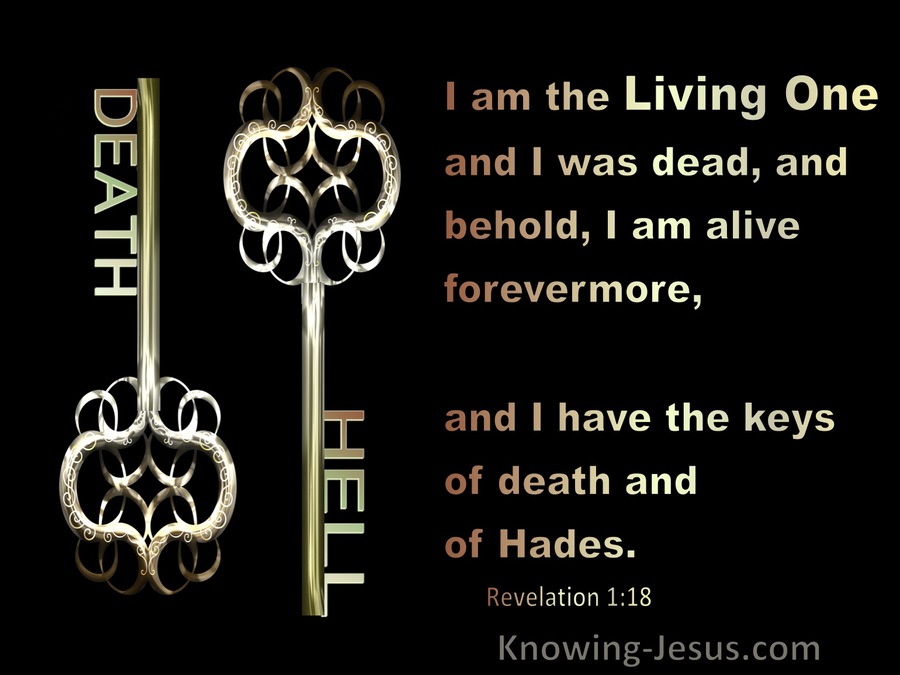 祂在拔摩海岛上对祂的使徒约翰说,“我是那存活的,我曾死过,现在又活了,直活到永永远远,并且拿着死亡和阴间的钥匙。”(启一18)