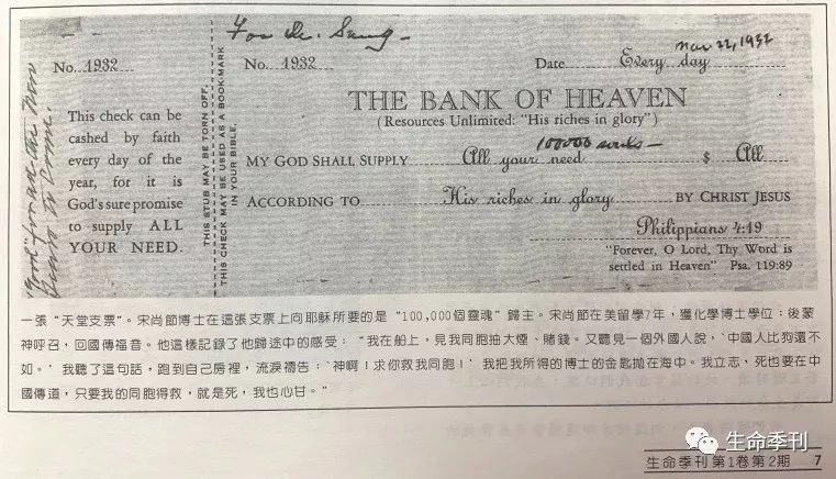 上图为《生命季刊》第2期(1997年6月)刊登的宋尚节的“天堂支票”。