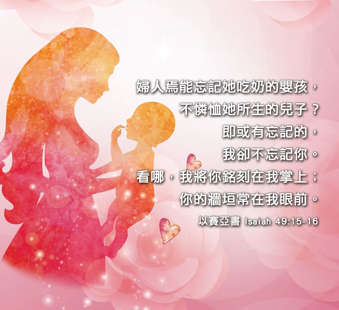 “妇人焉能忘记她吃奶的婴孩,不怜恤她所生的儿子?即或有忘记的,我却不忘记你。看哪,我将你铭刻在我掌上,你的墙垣常在我眼前。”(赛49:15–16)