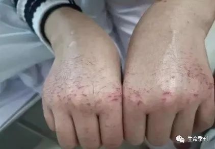 我每天要多少次用护手霜,因为常常有好几个手指头会裂开;但这些医护人员,终日戴着手套,手套里有滑石粉,脱掉以后,还要浸泡在消毒液、洗手液之中。这么多天下来,本来白嫩的手,被腐蚀成这个样子!满是伤痕,依旧坚持在一线。