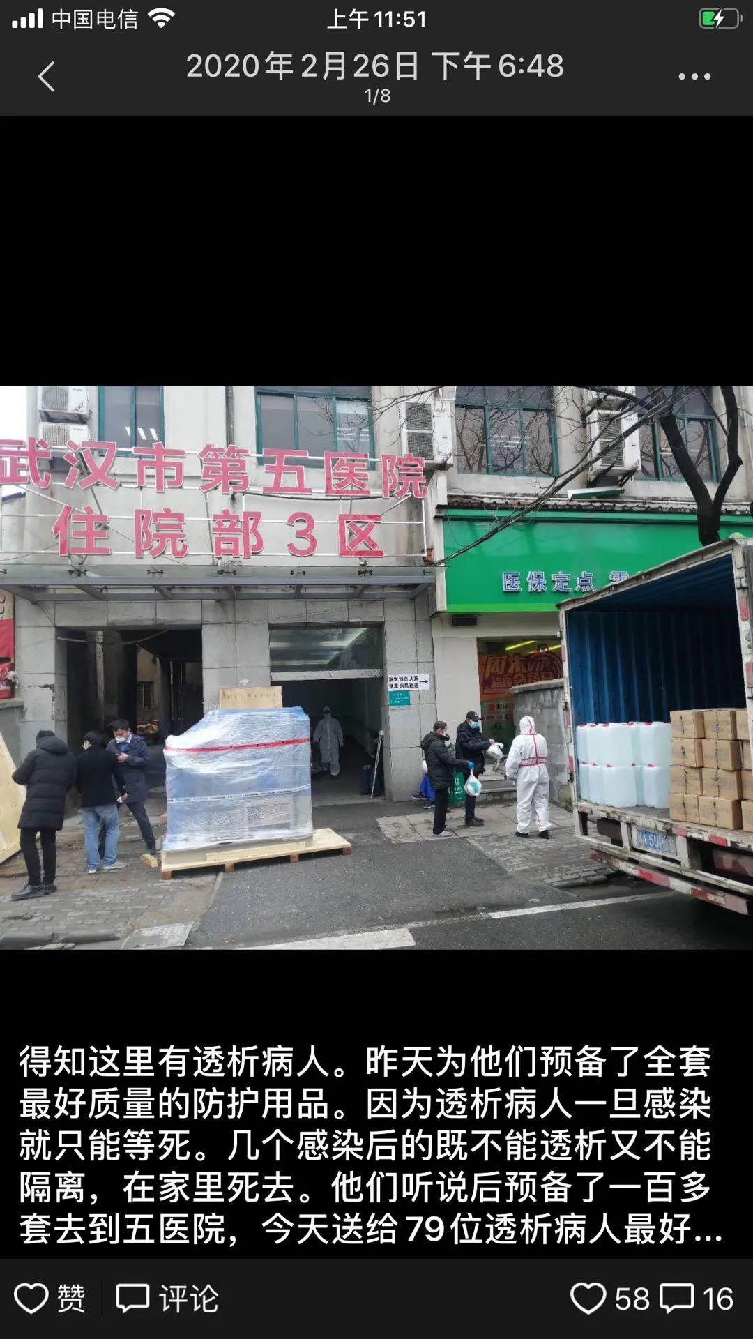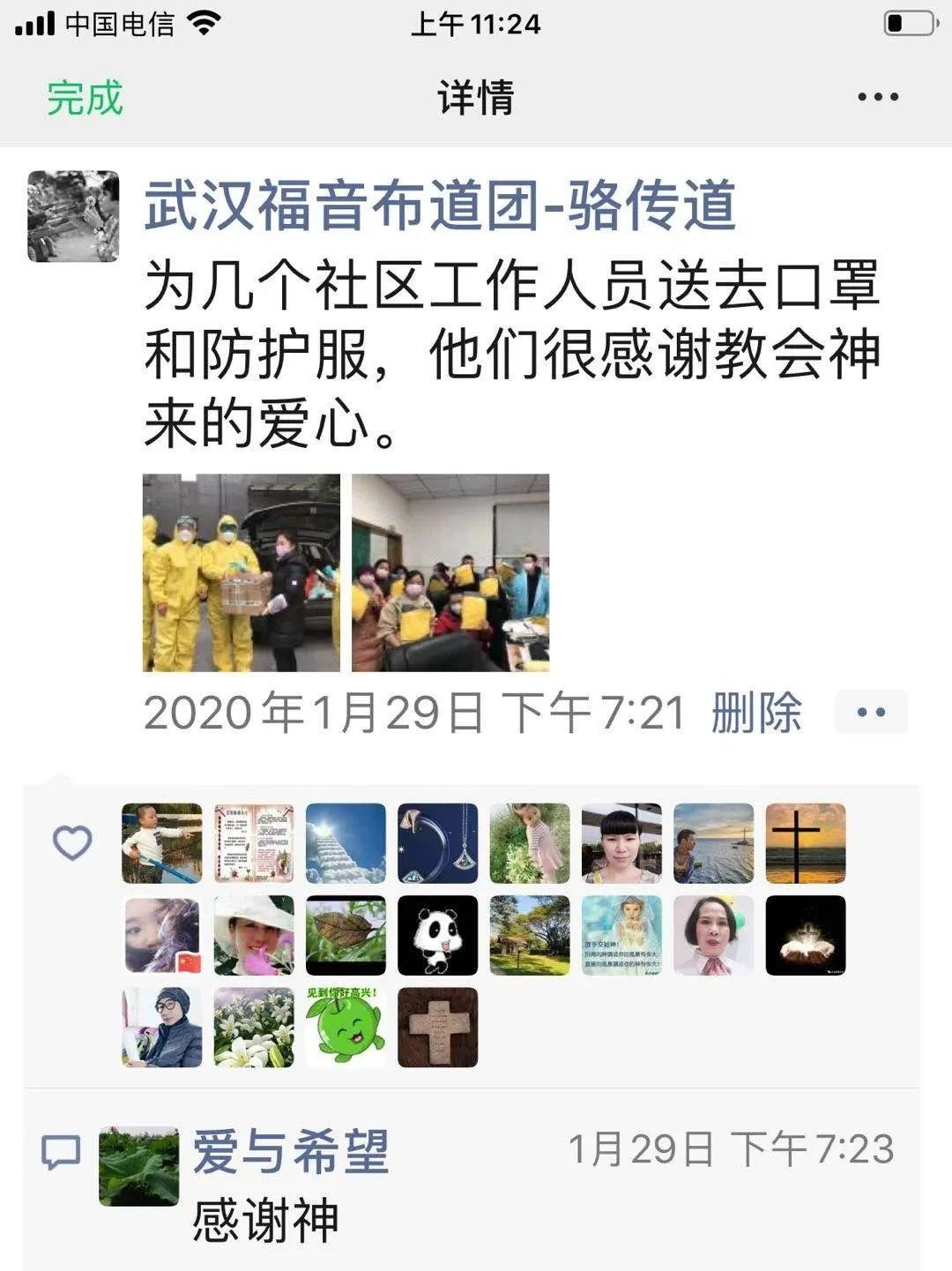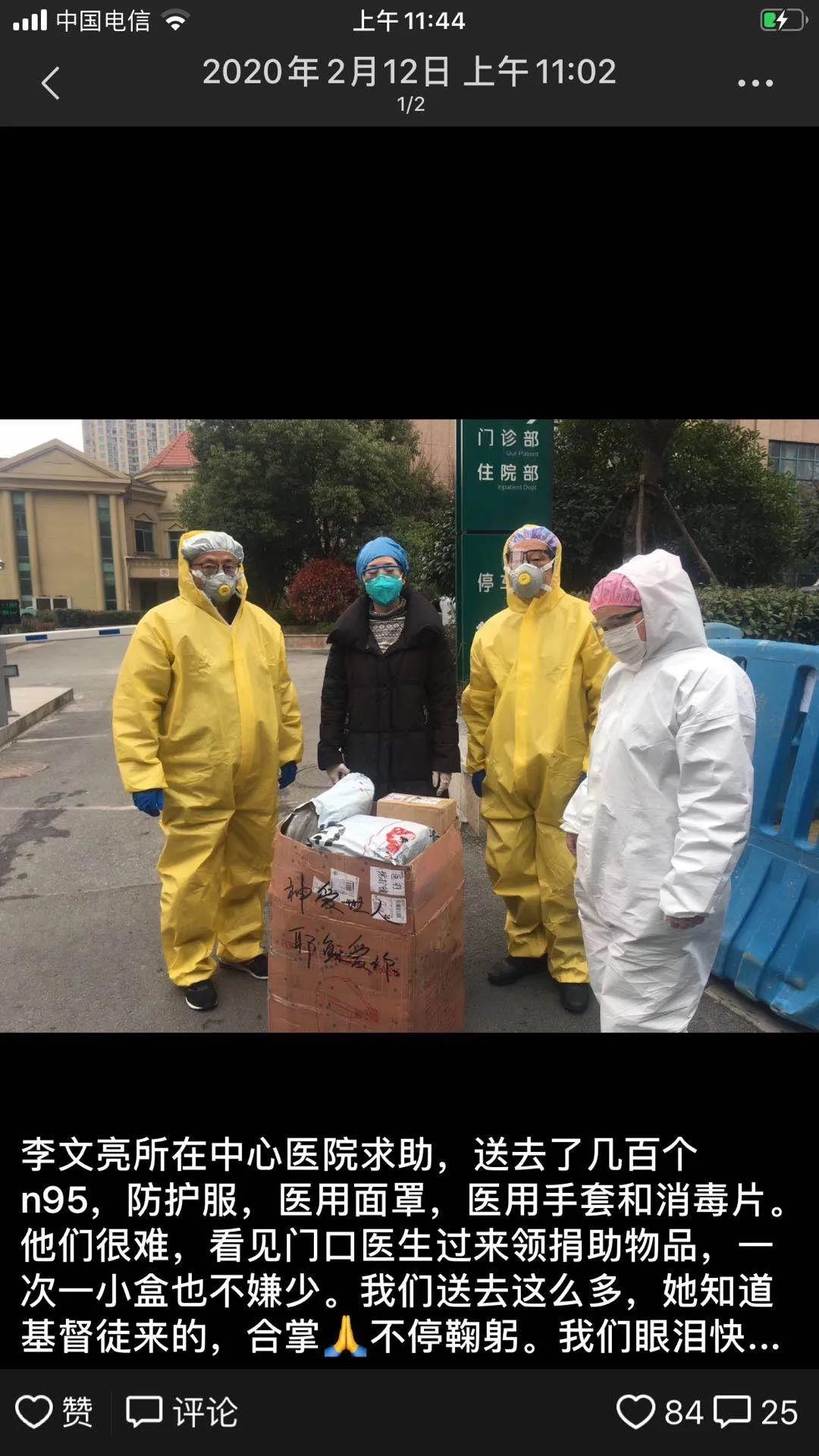 武汉中心医院因为李文亮事件而更加缺少防护品,很多医生感染。教会五次给他们送去急需的防护品。武汉第一医院、硚口军需医院、协和肿瘤医院和市内民营医院求助时也及时送去大量防护品。一些市郊卫生院,医务人员连最基本的防护品都没有。肢体们想办法开车出城,送去大量物资,及时帮助他们。
