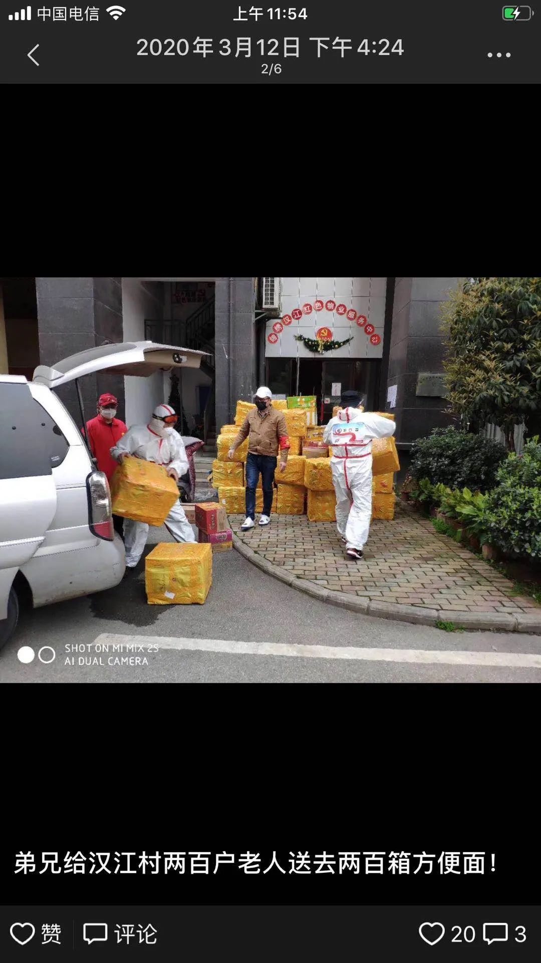 汉阳的汉江社区求助,两百多个残疾人和重病患者需要食物和防护品。肢体们开车送去几百箱方便面和防护品。社区工作人员和居民都知道是神来的爱心。