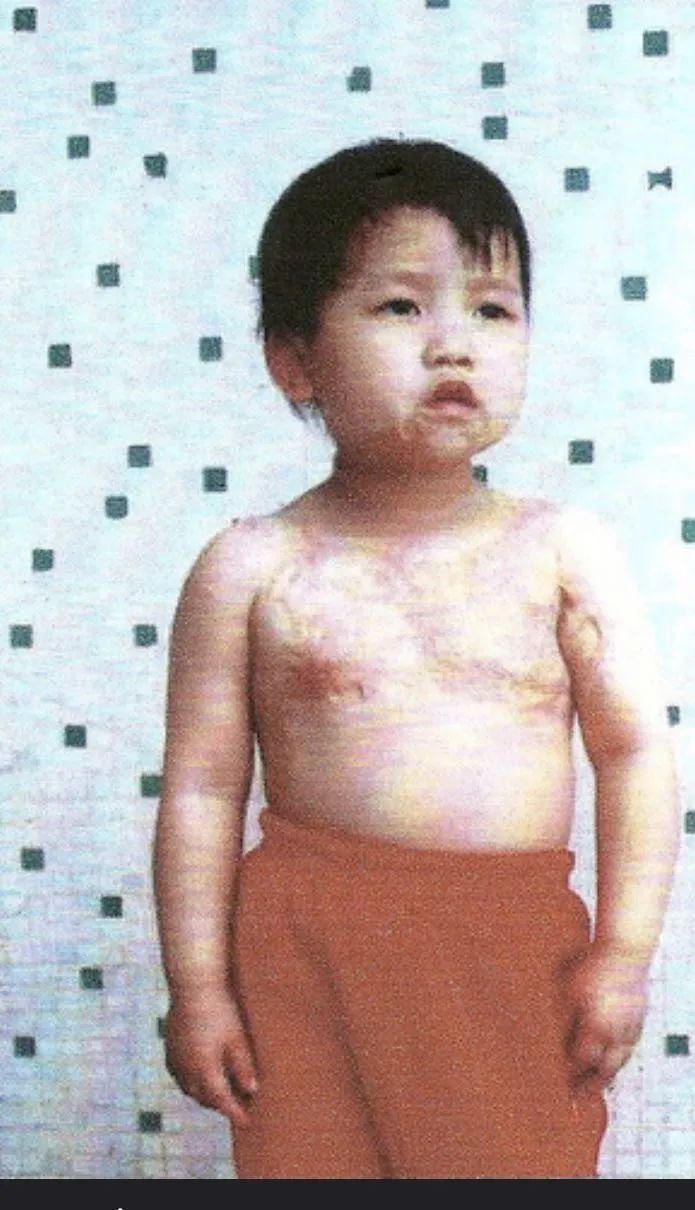 当年孤儿院给寄来的布蕾的照片。下巴和上身有明显的烫伤,一个乳头被烫毁。