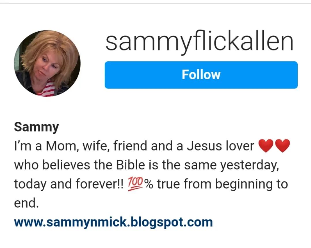 上图是珊米社交媒体的首页。她自我介绍道:我是一位母亲、妻子、朋友、一位热爱耶稣的人。我相信圣经昨天、今天、直到永远都是一样的。从起始到末了,圣经都是100%真实的。