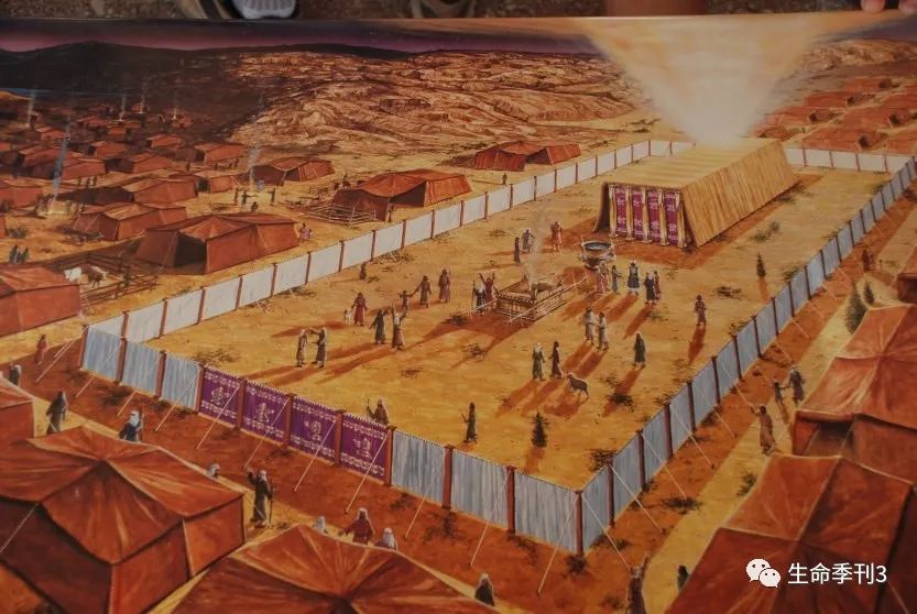 最后一步,就是把外院四周的柱子、帷子立起,用橛子固定,挂上院子的门帘。正月初一那天耶和华的会幕在以色列百姓中立起,摩西终于大功告成。这个图是现在以色列南部亭拿公园展出摩西会幕1:1尺寸的实体模型,可以让我们对当时摩西立起的会幕有一个概念印象。我们也注意到,祭坛四周有斜坡,按照传统的说法,这是摩西遵照神的吩咐:祭司上祭坛不可以使用台阶(20:26)。工匠为此特别设计出来的。他们对于遵守神的命令一点都不马虎。