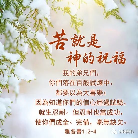 “我的弟兄们!你们落在百般试炼中,都要以为大喜乐;因为知道你们的信心经过试验,就生忍耐。但忍耐也当成功,使你们成全完备,毫无缺欠。”(雅1:2–4)