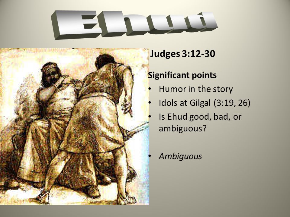 以笏的敌手伊矶伦,摩押王,身体肥胖,国势强盛,侵略以色列不遗余力,联合盟军亚们人,亚玛力人,把以色列人打得落花流水,因为他不断的强盛,伊矶伦也愈来愈贪得无厌,愈多愈好!
