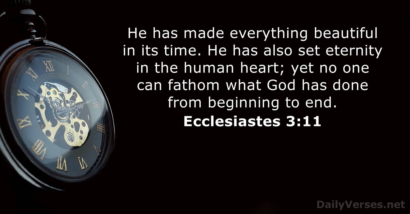神造万物,各按其时成为美好,又将永生安置在世人心里。然而神从始至终的作为,人不能参透。(传道书3:11)