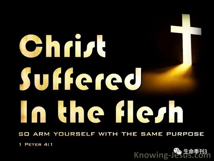 这段经文谈到两种“肉身受苦”。一是,基督在肉身受苦。基督是无罪的羔羊,祂的受苦,乃是圣洁无瑕的羔羊代替我们的罪受苦,为世人的罪作赎价。正如以赛亚书上说:“祂诚然担当我们的忧患,背负我们的痛苦。我们却以为祂受责罚,被神击打苦待了。哪知祂为我们的过犯受害,为我们的罪孽压伤。因祂受的刑罚我们得平安。因祂受的鞭伤我们得医治。”(赛53:4–5)
