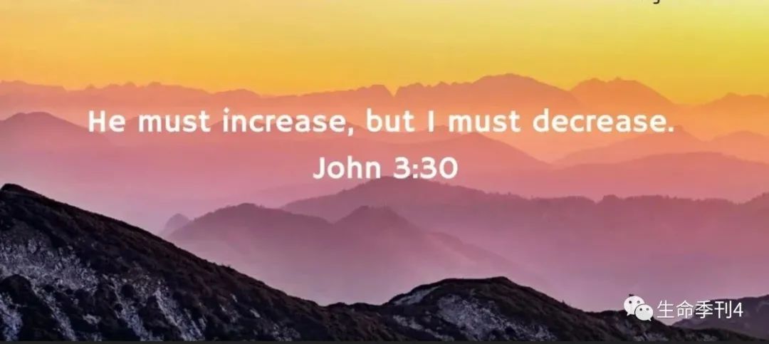 “约翰说,‘若不是从天上赐的,人就不能得什么。我曾说,我不是基督,是奉差遣在祂前面的,你们自己可以给我作见证。娶新妇的,就是新郎。新郎的朋友站着听见新郎的声音就甚喜乐。故此我这喜乐满足了。祂必兴旺,我必衰微。’”(约3:27–30)