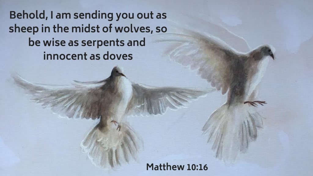 “我差你们去,如同羊进入狼群;所以你们要灵巧像蛇,驯良像鸽子。你们要防备人;因为他们要把你们交给公会,也要在会堂里鞭打你们,并且你们要为我的缘故被送到诸侯君王面前,对他们和外邦人作见证。你们被交的时候,不要思虑怎样说话,或说什么话。到那时候,必赐给你们当说的话;因为不是你们自己说的,乃是你们父的灵在你们里头说的。”(太10:16~20)
